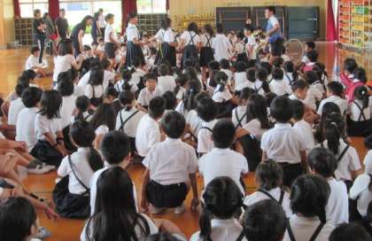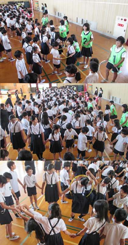 今日の児童集会は「フラフープリレー」。班全員で手をつなぎ、手を離さずにフラフープを後ろまで送るというゲームです。