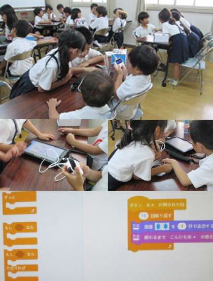 昨日、1・2年でプログラミングのグループ学習を行いました。今回は、画面上のパンダの顔や声を変化させるというプログラミングです。