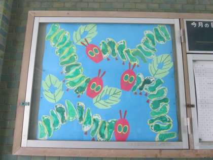 玄関入ってすぐ右上(今月の予定の左側)に、絵本で有名な「はらぺこあおむし」が掲示されています。とても上手ですが、よく見てみると…!