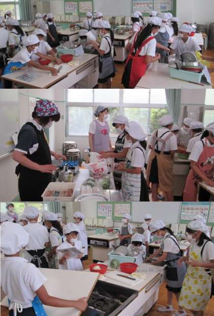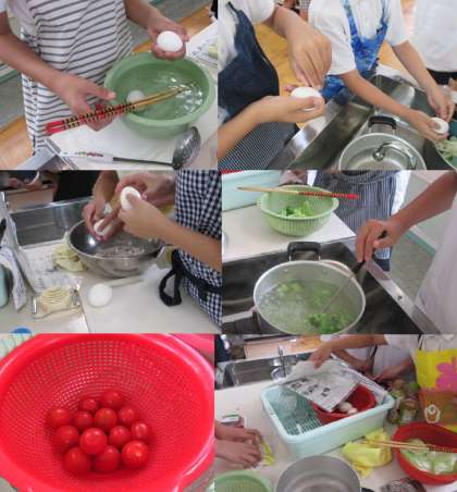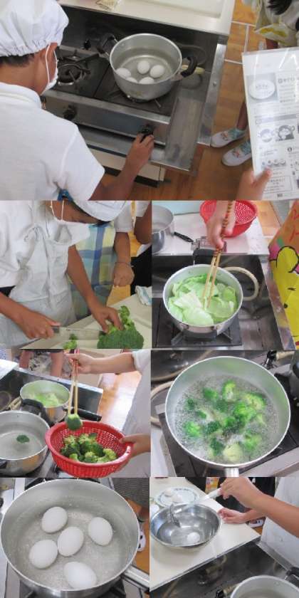 エプロン・帽子・マスクをつけ、ゆで卵・ゆで野菜作りスタートです。班の中で分担して、手際良く行っています。