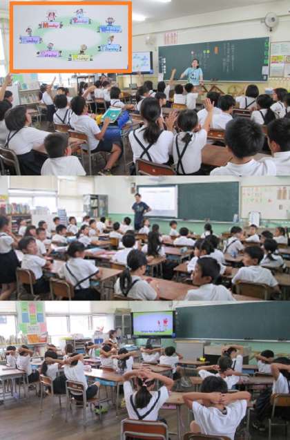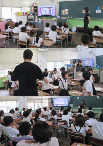 今朝も各教室から外国語活動の声や歌が聞こえてきます。クイズ形式で曜日を答えたり、映像に合わせてジェスチャーをしたりと、様々な活動が行われています。