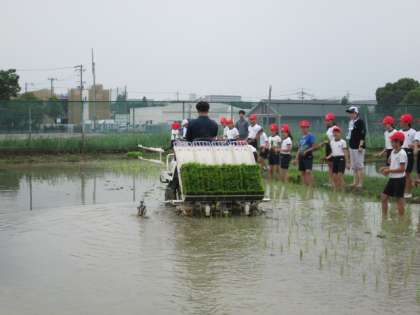 ある程度田植えが進むと、田植え機を使う様子を見せていただきました。あっという間に、みんなで植えた量よりも多く植えることができていました。社会科で習った「機械化」の意味を実感できましたね。