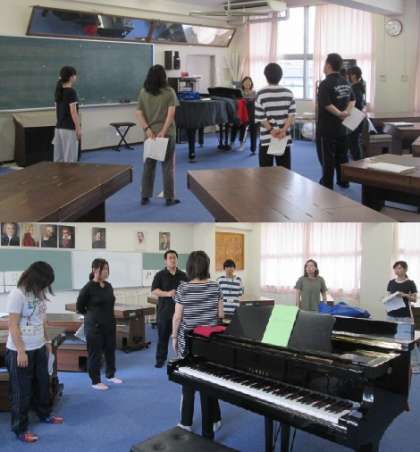 音楽の歌唱の指導について、発声法や姿勢等の基本的なことから合奏指導等にいたるまで、自分たちが児童になりきって教わりました。
