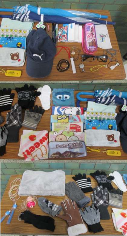 玄関入ってすぐ右側に並べている様子です。懇談で来校された際じっくりと見ていただき、ご自分のもの、またはお子さまのものと判明した場合は、お持ち帰りください。その後、すぐに記名をお願いします。