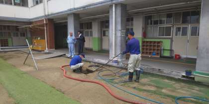 この日は、中庭に埋設されている排水溝(排水会所)の清掃作業が行われました。1年生の教室の前には、手洗い所が2箇所あります。大雨のとき、手洗い所にある排水溝で水があふれてしまうことがありました。中庭は子どもたちが一輪車に乗って遊んだり飛び石などで遊んだりする場所です。雨などが降ると、どうしても土が排水溝に流れこんでしまいうため、排水溝に土などがたまってしまいます。