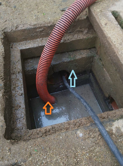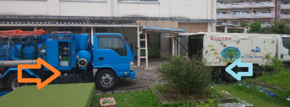 まず、ふだんはしっかりと閉じられている排水溝の蓋が開けられました。そして、高圧洗浄機を載せたトラックから、排水管の中に高圧の水が送られます。(青→)その水で管の中で詰まっている土が溝に出てきます。かき出された土をもう1つのホースで強力に吸い上げます。(赤→)この作業を何度も繰り返し、中庭全体の排水溝の通管作業が行われました。
