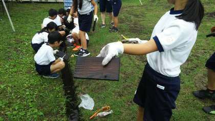 自然の中での創作活動です。宿舎の方が、事前にバーナーで焼いてくださっている木の板の表面は、炭だらけです。この炭を持参した古い歯ブラシを使って磨きます。小さな水路を流れる水につけながら磨くのですが、簡単には炭が取れません。根気よく磨き続けると、次第に表面の炭が手に付かないぐらいに取れ、さらに磨くと光沢が表れます。木の板の表面の年輪は一人一人様々で、同じものはありません。今日はしっかりと乾燥させ、明日、専用のペイント剤で描画をします。「明日はどんなものを板に描こうか」と今から考えるのも楽しみです。