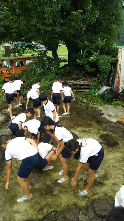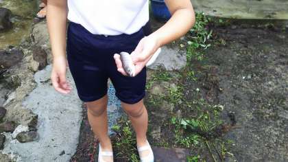 続いて宿舎近くにつくられた池での魚つかみです。中にはたくさんのマスが放されています。