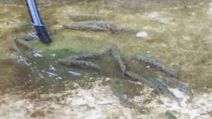 上靴をはいて池の中に入るのですが、山の湧き水をそのままひいているので、とても冷たいです。魚の表面はぬるぬるとしていて、素手でつかむのは至難のわざです。魚のひそんでいるくぼみや、魚が向かう方向に狙いを定めて、一気につかみます。つかんで安心してしまうと、するっと魚が逃げてしまうこともあります。「とったー!」
