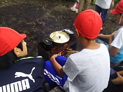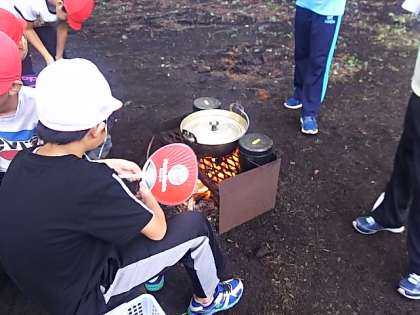 下ごしらえが済んで、火にかけます。火が消えないように、うちわであおぎます。