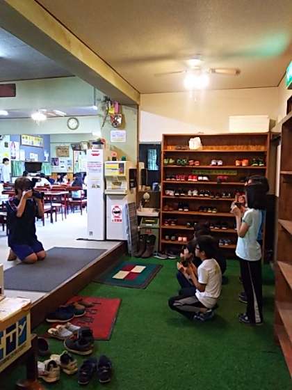 子どもたちは元気です。朝の集いは室内で。活動班ごとに、焼き板を持って記念撮影です。この後、朝食のカートンドックを作ります。お腹空いたよ〜ぅ。
