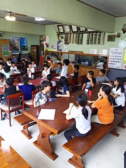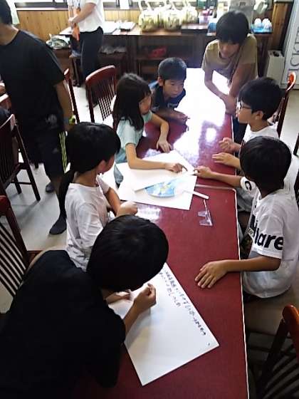 しりとり。よく知っている遊びも、成績がかかると盛り上がります。班の協力ぶりが、ものをいいます!