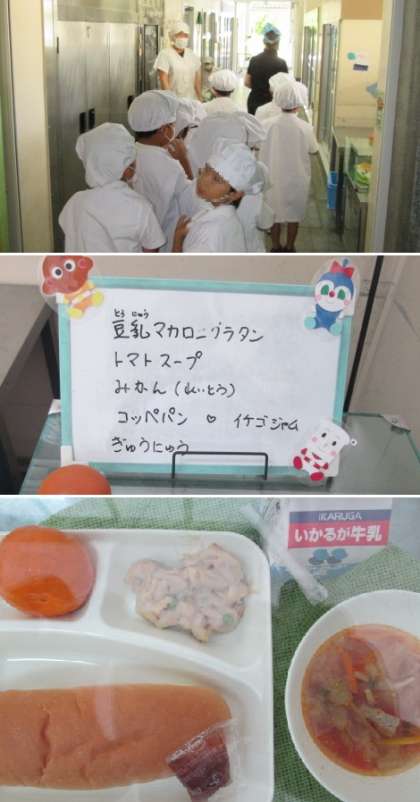 今日の献立は「豆乳マカロニグラタン、トマトスープ、みかん(冷凍)、パン、牛乳」です。豆乳マカロニグラタンは小麦や乳のアレルギーのある児童も給食が食べられるように配慮されたメニューで、マカロニやパン粉は米粉でできており、ルーには上新粉と豆乳が使われています。もちろん、とっても美味しかったですよ!!