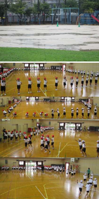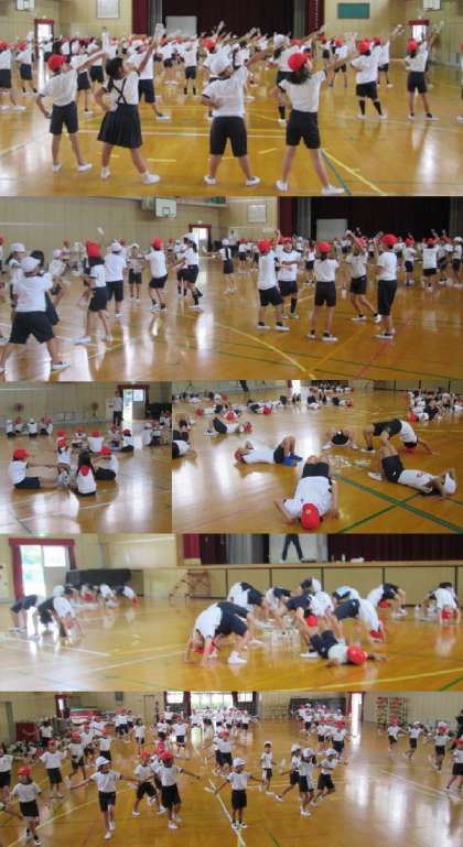 足を出すタイミングや右・左など動きを合わせたり、全体の隊形だけでなくグループごとの動きや動き出しの音楽を確認したり、各学年とも体育館で工夫して練習しています。