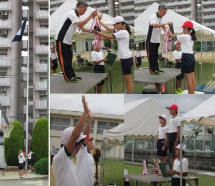 校旗の掲揚、優勝カップ・準優勝たての返還、宣誓の言葉、とても上手にできました。得点についての説明、緊張が伝わってきます。