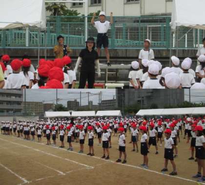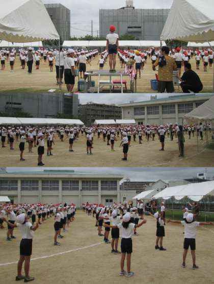 指揮者を見て、大きな声で運動会の歌を歌いました。はじめのラジオ体操では、指揮台の児童を見て、しっかりと体全体を動かしました。