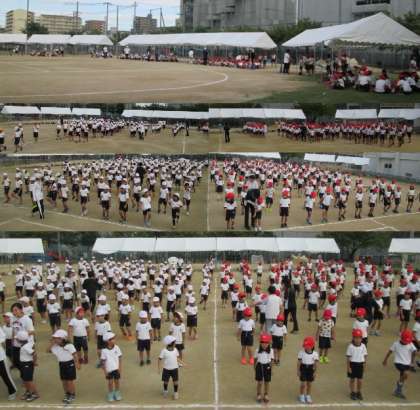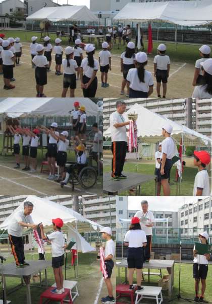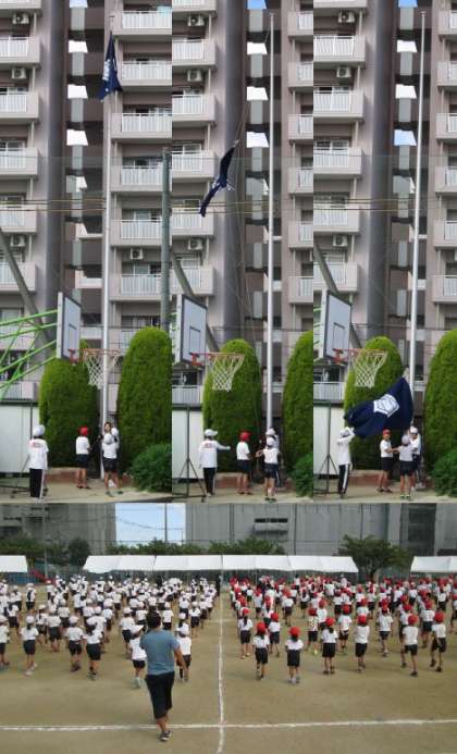 今朝は少し涼しく感じます。全体練習2日目、今日は閉会式の練習です。得点発表、優勝カップ・準優勝盾の授与、記念品授与、みんな緊張しています。校旗が降ろされ、閉会式練習は終わりました。