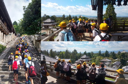 園地を後に、公園内を歩きながら第3の目的地の「二月堂」に向かいました。ここは毎年3月に、松明(たいまつ)が火の粉を散らしながら舞台を回る『お水取り』が有名です。急な階段を上がって舞台に進むと、さわやかな秋の風が吹き、遠く奈良の市街地を見渡すことができました。