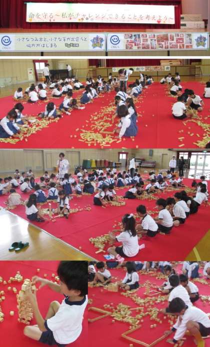 10月15日(火)、「オイスカ」の方が用意してくださった、間伐材でできた「つみ木」。1年生が天宗瓜破東園年長組と一緒に活動しました。