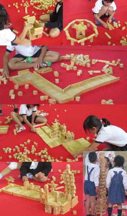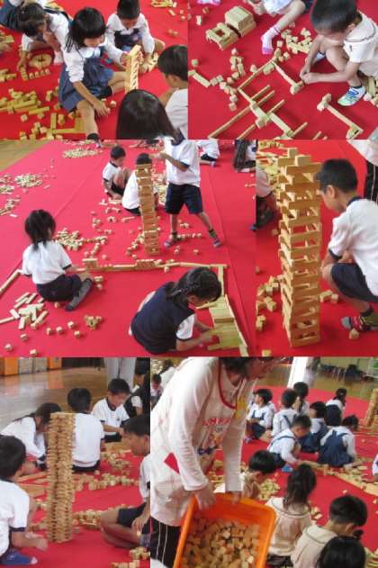 講堂に敷かれた赤いカーペットの上で、一人ひとりに十分な量のつみ木が配られ、活動開始!初めは一人で積んだり並べたりしていたのですが、いつの間にか一緒に。つみ木が高くなったり長くなったりしてきました。線路だったりお花だったり、つみ木ワールドが広がります。