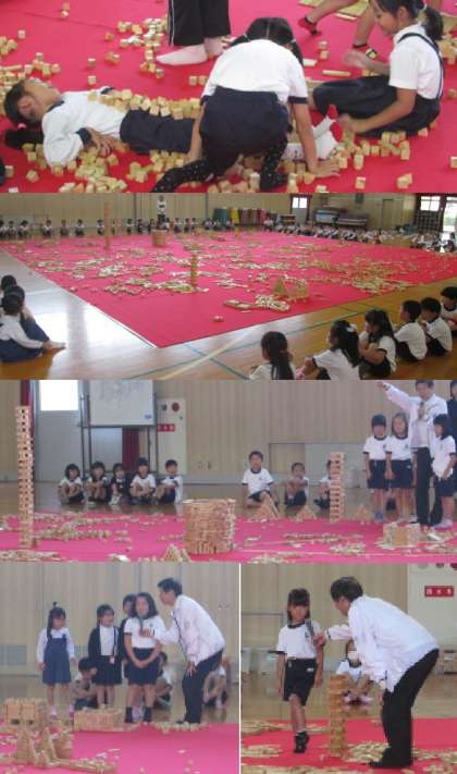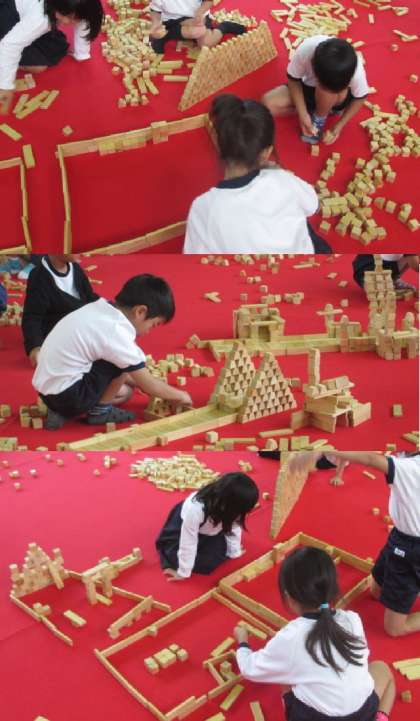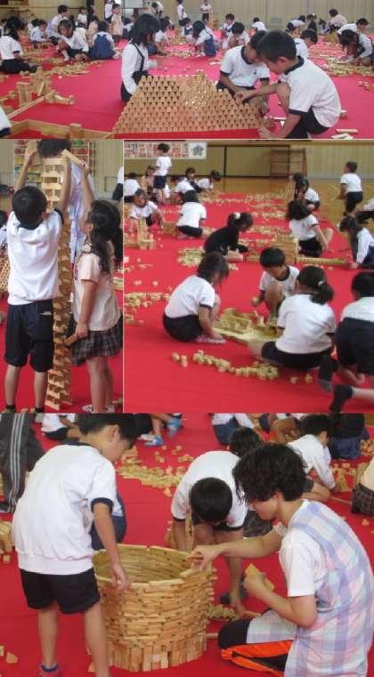 そのうちに、作品がどんどんつながっていきました。子どもたちのアイデアがたてに横に膨らんでいきます。しまいには、体の上に並べる子も!