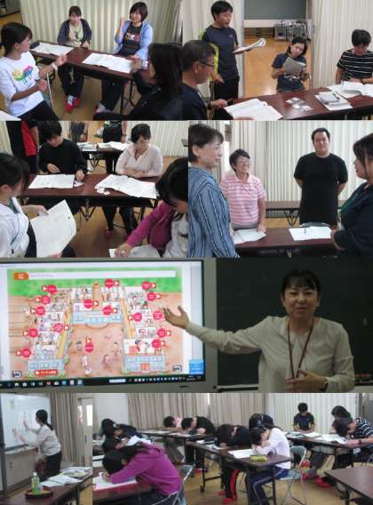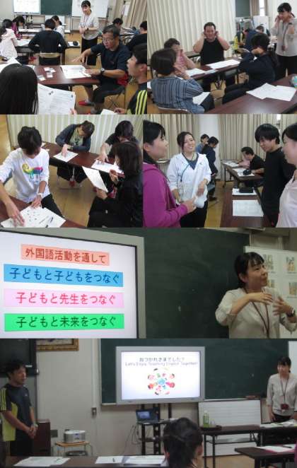 はじめは生徒になって、次にグループに分かれ先生役と生徒役になって、様々な方法で英語に慣れ触れ親しめる活動を行いました。