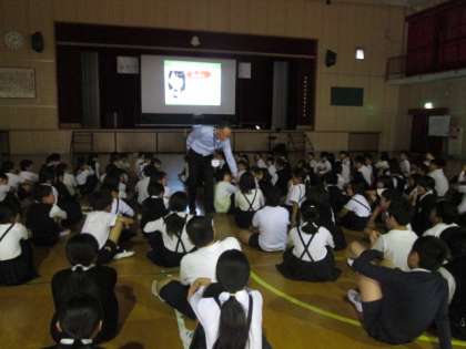 今回は、名古屋支店より講師の方に来ていただきました。45分間という限られた時間の中で、小学校中・高学年に起こりやすいトラブル事例を、「怖さ」を実感できる動画等を使って紹介されました。また、トラブルを回避するためのポイントや、万一トラブルに巻き込まれてしまった場合の対処法について教えていただきました。