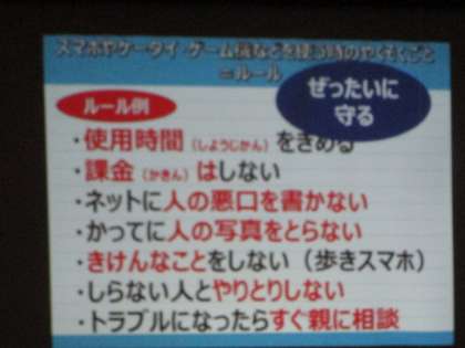 講師の方は、「これからの時代は、スマートフォンを使うデメリットよりも、使わないデメリットの方が大きくなるかもしれません。しかし、特に小学生では、各家庭で使用するときのルールをしっかりと決め、フィルタリングサービス等を活用してもらうことが大切です。」と話されていました。
