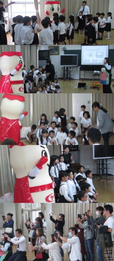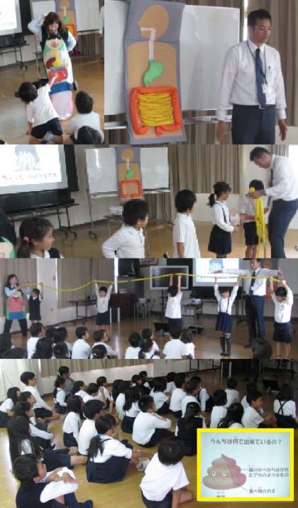 人体の模型を使って考えました。腸の長さが6mもあることを知ってビックリ!DVDを見たり、おなか元気体操をしたり、体全体を使って学習しました。最後にはヤクルトマンと記念撮影!保護者の方も参加して、ミニ撮影会になりました!!