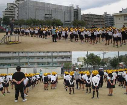 朝会での校歌斉唱。子どもたちの声が、秋の空に響き渡るようでした!!