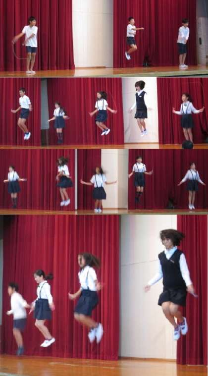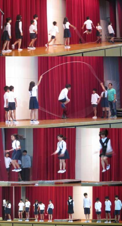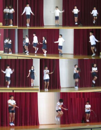 今日の児童集会は、スポーツ委員会の発表。10/21〜11/15は、なわとびでの体力づくり週間です。それにちなんで、なわとびの様々な技を披露してくれました。