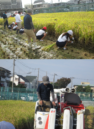 10月30日(水)、5年生が久々に田んぼに戻ってきました。1学期に大阪市営農センターで田植え体験をさせてもらってから、この日が2回目となります。長細い苗が、金色の穂が垂れるまでに立派に生長していました。