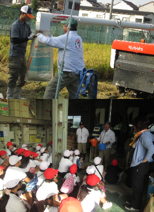 そして、機械を使って稲ともみをわける「脱穀」する様子を見ました。あっという間に、大きな袋にもみ(米)が詰められていきます。最後に、もみをしっかりと乾燥させる大きな機械を見学しました。