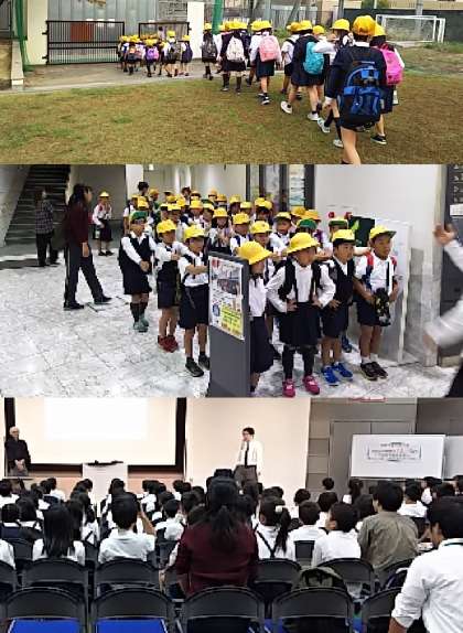 まず、3階ホールで「体験学習」。昔のくらしの中で使われた実物資料を使って、クイズをしながら楽しく学ぶことができました。
