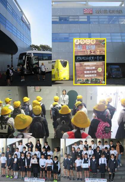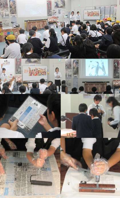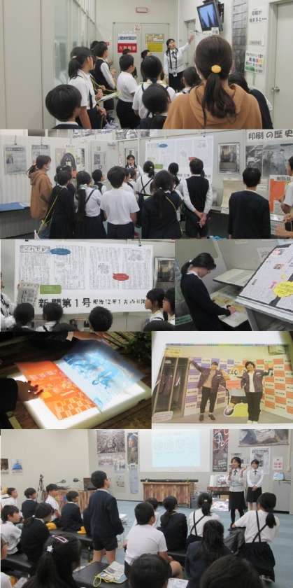 到着後、クラスごとに記念撮影をしました。工場内では、映像を見ながら、新聞記者から配達員の方まで多くの人の関わりがあって新聞ができあがること、また、4色のインクで、様々な色を出せることを学びました。「オフセット」の体験もしました。