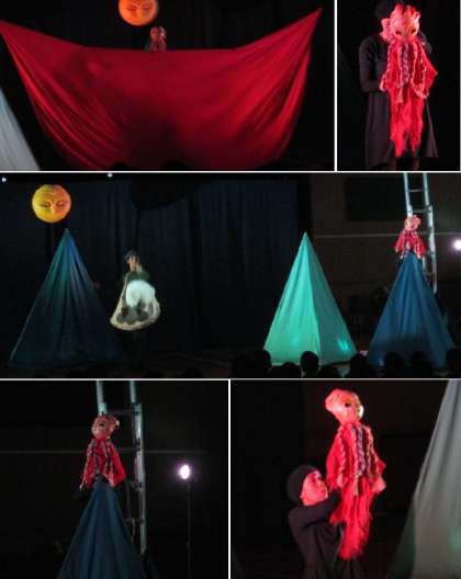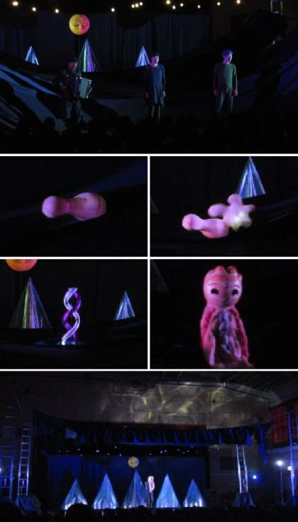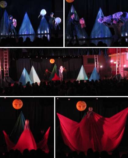 この劇は、「トクントクン〜いのちの旅〜」という絵本がもとになっています。体育館は、いつもと違う雰囲気。暗い中、3人の方々が、人形やオブジェを駆使して、お話が進められました。台詞はありません。きれいな歌声、リズミカルな動きや様々な小道具、舞台効果、映像…。今まで味わったことのない世界が、どんどんと繰り広げられました。