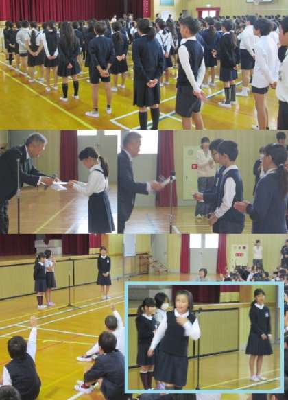 朝会では、夏休みにがんばって作った作品が評価され、4人に表彰状が贈られました。その後、4年生の代表委員が、「ストップ5秒運動、ちゃんとしましょう」と、みんなに呼びかけました。