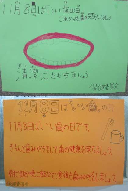 保健委員会では、11月8日「いい歯の日」を通して何かできることはないか話し合い、「ポスター作り」と「うがい週間の呼びかけ」をすることに決めました。