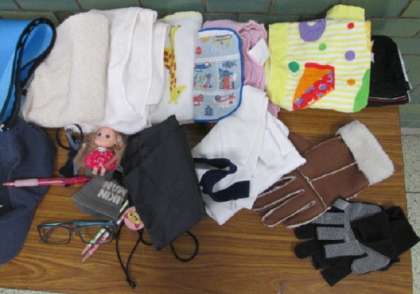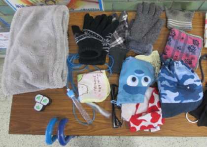 玄関入ってすぐ右側に、落とし物を並べています。参観・懇談や作品展で来校された際、じっくりと見ていただき、ご自分のもの、またはお子さまのものと判明した場合は、お持ち帰りください。その後、すぐに記名をお願いします。