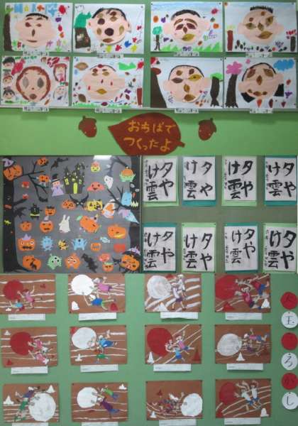 校内の掲示板に掲示している、子どもたちの作品やカードの一部です。