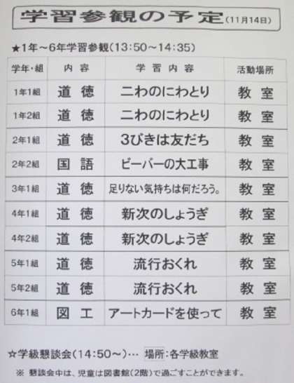 参観は、下記の予定で行われます。子どもたちの学習の様子を観ていただければと思います。授業中は、学習活動の妨げにならないよう、静かにご参観ください。