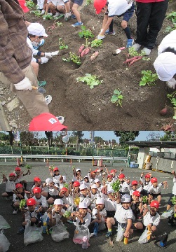 19日(火)朝、手袋・袋・移植ごてを持って菜園へ。子どもたちは、一人一株分掘らせていただきます。手入れの行き届いた黒々とした土の中から、美味しそうなサツマイモがどんどんと顔を現してきます。短い時間でしたが、どの子どもも収穫したサツマイモで袋がいっぱいになりました。