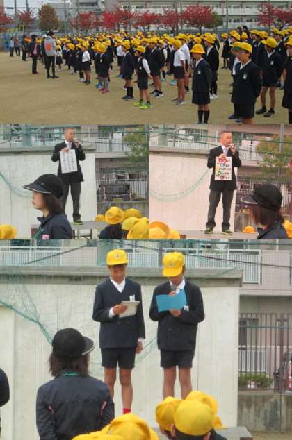 児童朝会では、校長先生から、小学生がいなくなり栃木県で保護された事件を受けて、「一つしかない命、絶対に大切にしてほしい。そのためにも、『考えて行動する子』になってほしい。【い、か、の、お、す、し】絶対に守りましょう。」とお話がありました。