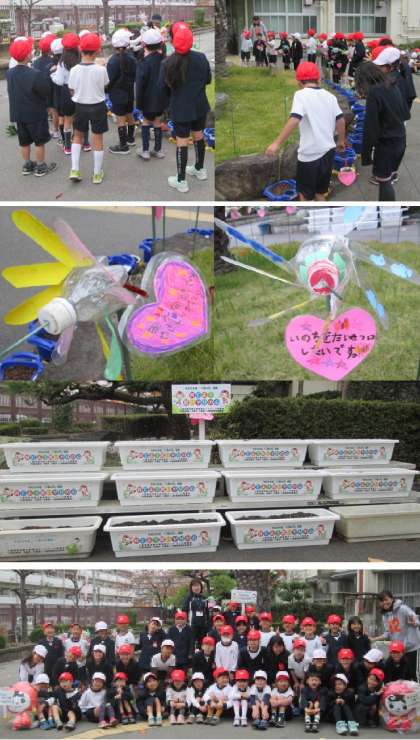 そして本日、一人ひとりがつくったメッセージカードをペットボトルの風車につけ、周りに飾り、みんなで記念撮影を行いました。