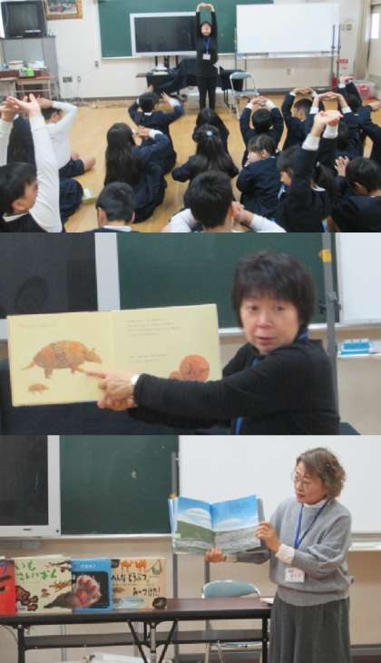 上から順に、2・3・4年生に実施していただいた時の様子です。皆さんの語ってくださる世界に、子どもたちはどんどん魅せられていきます。