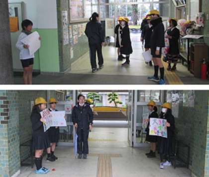 雨が降り続いています。あいさつ運動は玄関です。代表委員会の皆さんは、今朝も早くから登校してくれました。