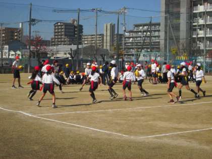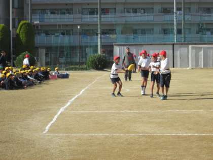 2年生にとっては、走りながら「タグ」を取ることは、「しっぽ取り鬼ごっこ」のような感覚です。後ろにパスをしながらつなぐということが果たしてうまくできるでしょうか。楽しみですね。