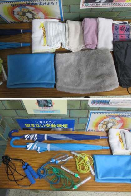 さて、玄関入ってすぐ右側に並べている様子です。懇談で来校された際じっくりと見ていただき、ご自分のもの、またはお子さまのものと判明した場合は、お持ち帰りください。その後、すぐに記名をお願いします。