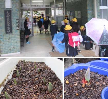 朝から寒さが厳しく、雨も降り出した中、代表委員会の皆さんは、明るく元気なあいさつでみんなを迎え入れてくれました。1年生が植えたチューリップは、芽を出しています。