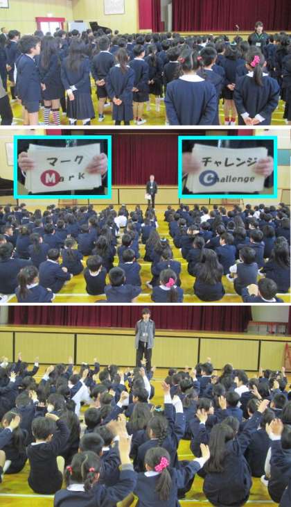 始業式の最初、校歌斉唱の際には美しい歌声が、講堂に響きました。その後、校長先生から「1月は行く、2月は逃げる、3月は去るといって、3学期はとても早く過ぎる。CM作戦、Mark【目標】をたてて、Challenge【挑戦】しましょう!」と、吉田先生から「冬休みの生活を振り返って」「1月の生活目標『進んで体力づくりをしよう』。マラソン大会もあるので、しっかり体を動かそう!」「校舎北側の道路工事が始まるので、注意しよう」と話がありました。